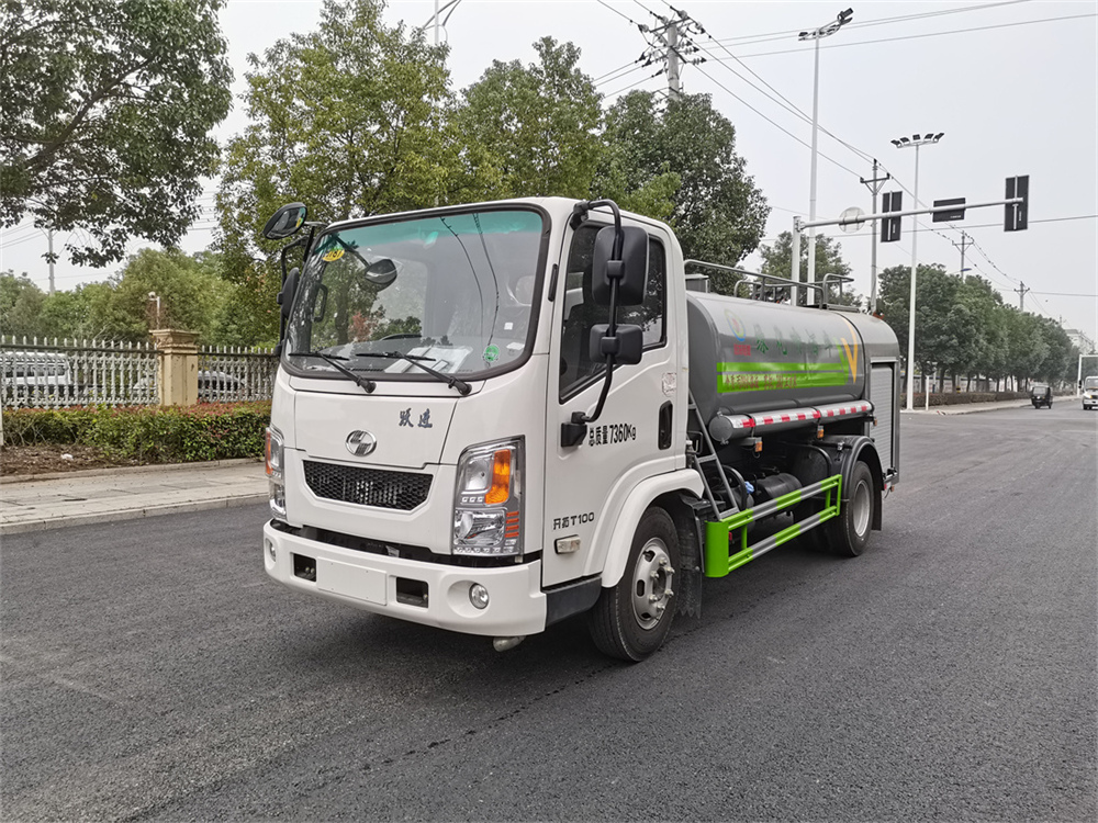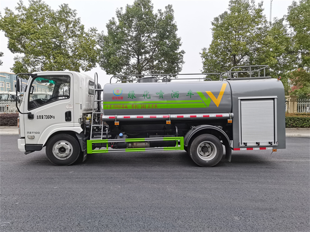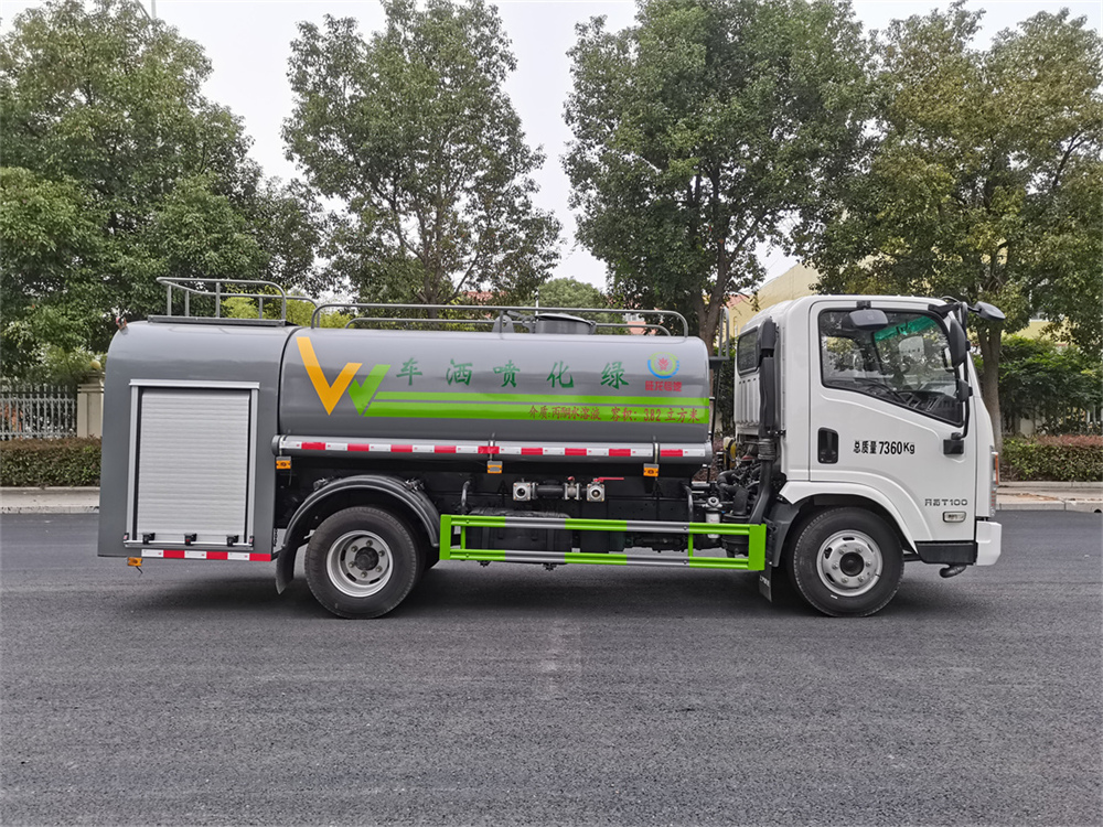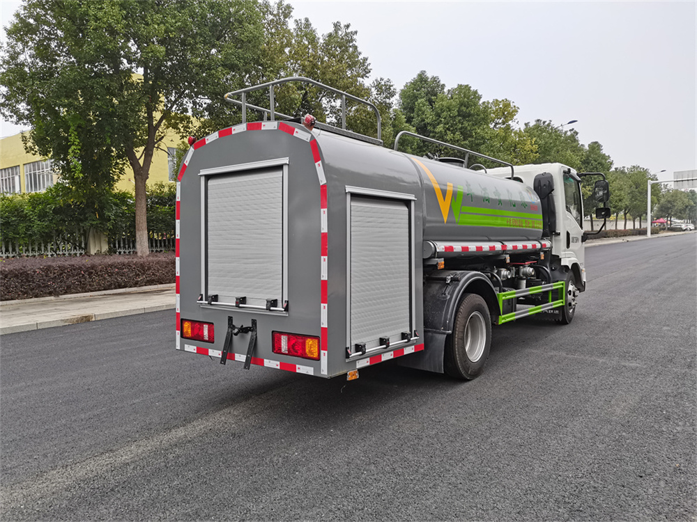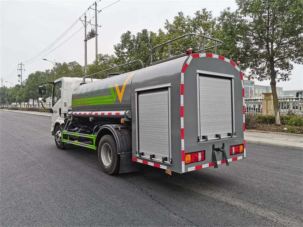 灑水車前裝有鴨形噴嘴或圓頭沖嘴,后面裝有圓柱開灑水噴嘴或蓮蓬頭噴嘴,后部有一工作平臺(tái),裝配有水炮。后部還可裝8個(gè)噴嘴(選裝)。