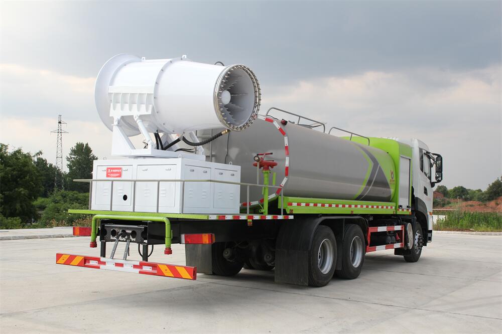 上裝配置:罐體容積為 16立方,選配風(fēng)送式霧炮機(jī)組射程30米、40米、50米、60米、80米、100米、120米霧炮,罐體鋼板為4mm碳鋼Q235材質(zhì),罐內(nèi)隔板具有防波作用,以減輕汽車行駛時(shí)罐體液體沖擊,罐體及整車外形尺寸按照公告。帶大功率專用灑水泵,泵可自吸自排,整車前沖、后灑、側(cè)噴、帶65消防接口,后平臺(tái)配CLW-50、CLW-60、CLW-80、CLW-100、CLW-120型風(fēng)送式霧炮機(jī)組;罐體前封頭配大功率柴油發(fā)電機(jī)組;前封頭帶水位計(jì),后平臺(tái)主管路帶1寸澆花接口,后爬梯。帶兩根輸水管及陰陽(yáng)端。罐體顏色:銀/灰/綠,罐體兩側(cè)噴“多功能抑塵車”字樣,貼反光標(biāo)示。